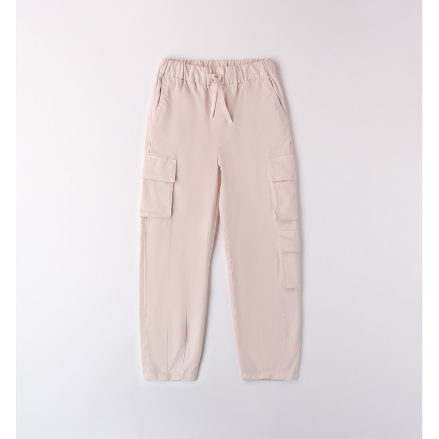 Pantalón confeccionado en sarga de algodón elástico. El modelo presenta cierre con cremallera y botón, bolsillos laterales, diseño en color liso y corte ancho. Cintura ajustable con elástico ojal interno.